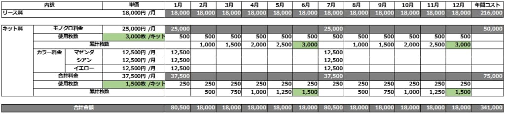 - 枚数が増えると高コスト: 印刷量が多いとトナー購入頻度が上がり、カウンター方式よりも高くつくようになります。