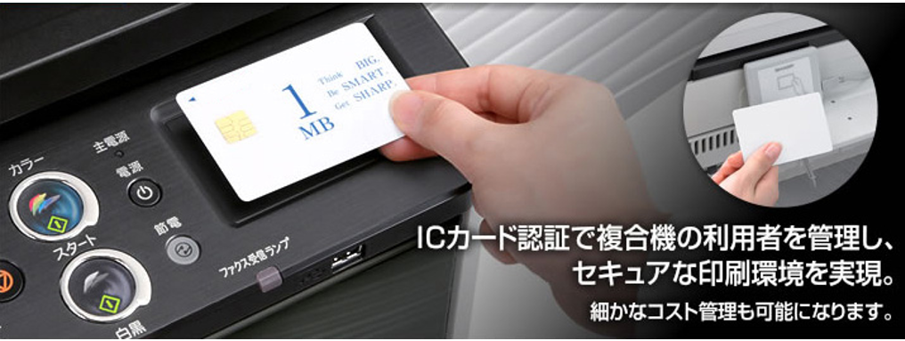 「ユーザーICカード認証システム」とは、印刷をICカード利用者のみに制限したり、誰がどのデータを出力したのかを情報収集することができます。