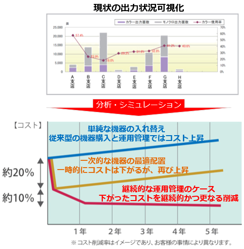 MPS(Managed Print Service)とは、現状の出力環境を徹底分析し、見える化することで、統制の取れた最適な環境を構築する包括的なサービスです。導入により、TCO(総保有コスト)の把握と削減、業務プロセスの効率化、環境負荷の軽減が可能になります。