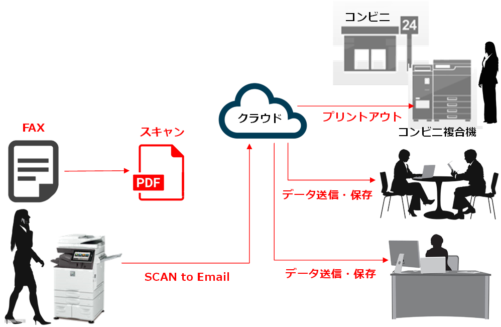 届いたFAXを紙で出力せず、自動的にPDF化して指定の共有フォルダやメールへ転送する機能です。PDFならあらゆるデバイスで閲覧でき、そのまま検索や管理も可能です。