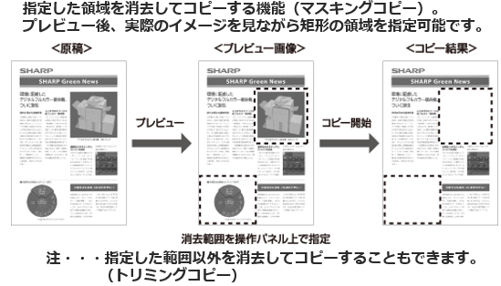 原稿の周囲の黒ずみやパンチ穴の影、ホッチキス跡などを自動的に消してコピーする機能です。見開き書籍の中央にできる影もキレイに消去できます。