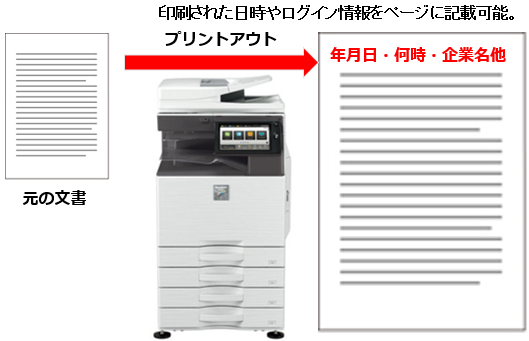 印刷物の余白に、日時やユーザー名、機器のシリアル番号を微細な文字で印字する機能です。万が一、重要書類が社外で見つかった際、「いつ、誰が、どの機械で印刷したものか」を即座に特定できます。