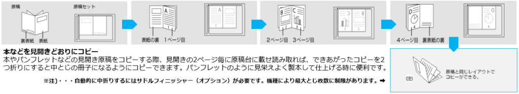 見開きの雑誌やパンフレットを読み取るだけで、自動的にページの順序を並び替え、両面印刷して中とじ冊子状に仕上げる機能です。