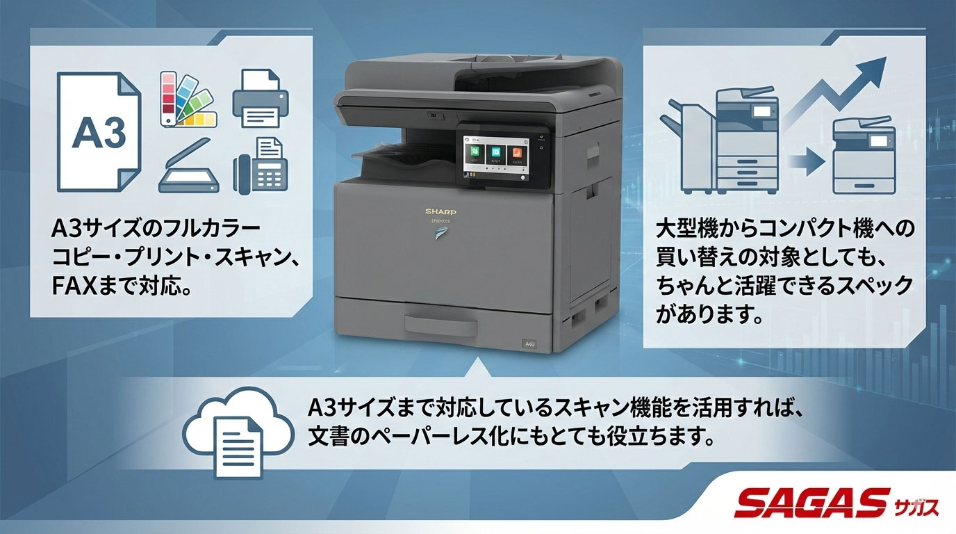 A3サイズのフルカラーコピー・プリント・スキャン、FAXまで対応。 大型機からコンパクト機への買い替えの対象としても、ちゃんと活躍できるスペックがあります。 A3サイズまで対応しているスキャン機能を活用すれば、文書のペーパーレス化にもとても役立ちます。