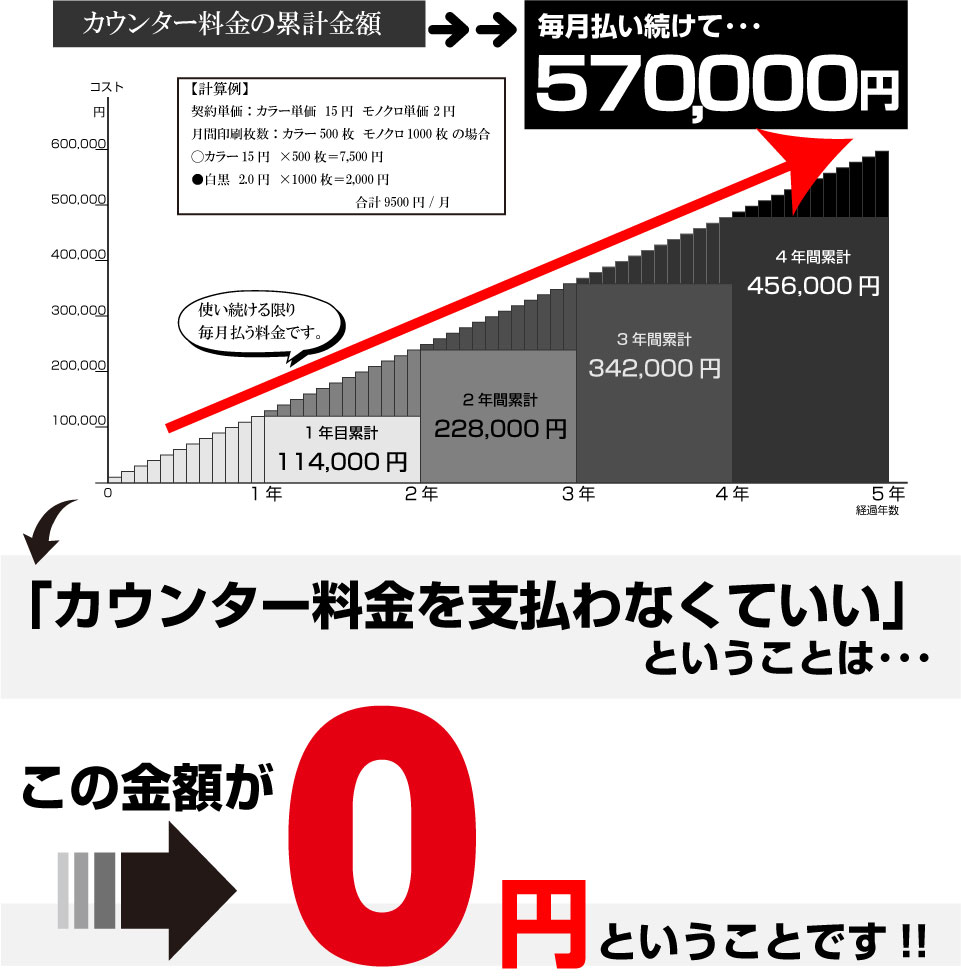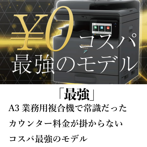 業務用機で「唯一」使用枚数に応じた課金=カウンター料金がないコスパ「最強」のモデルです。 一般的な業務用複合機は「カウンター契約」という、印刷枚数に応じた課金があります。多い方では月間数万円もお支払いになっています。 ところが、この複合機はそれがありません。0円です。